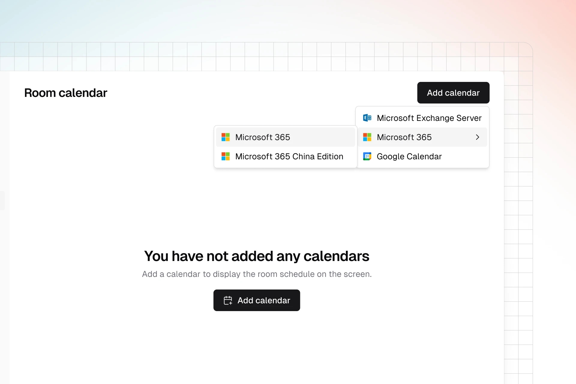 • 成功添加日历账户后,它会显示在“房间日历”设置页面。