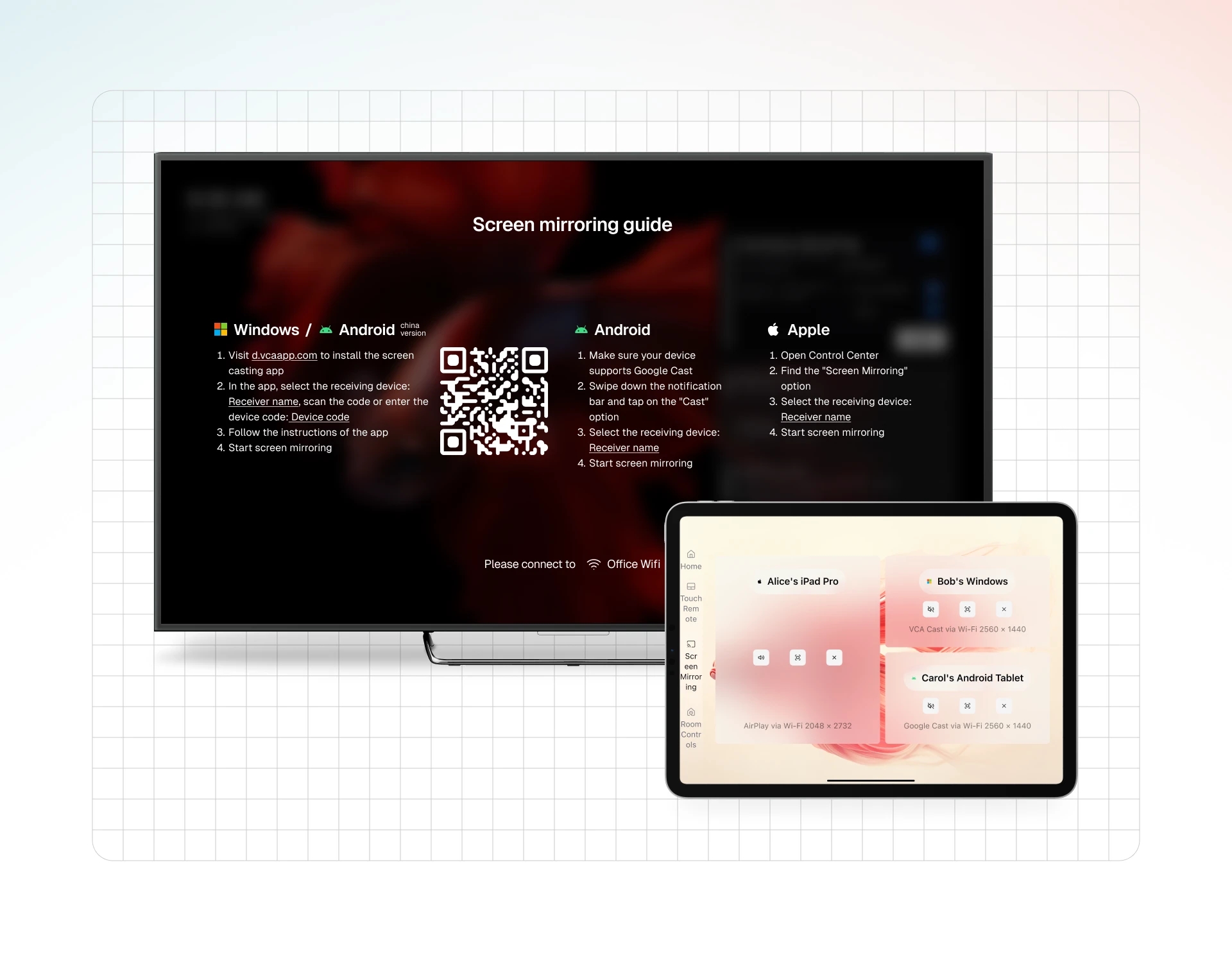 VCA 集成了企业级无线屏幕镜像功能。针对会议室场景深度定制开发,不含任何广告和无关功能。兼容所有主流协议,无需安装客户端即可开启屏幕镜像。充分利用视频会议主机强大的音视频编解码能力,带来高画质和帧率的屏幕镜像体验,文字显示清晰锐利。支持多路并发投屏,满足会议室多人协作需求。